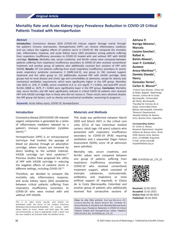 Mortality Rate and Acute Kidney Injury Prevalence Reduction in COVID-19 Critical Patients Treated with Hemoperfusion