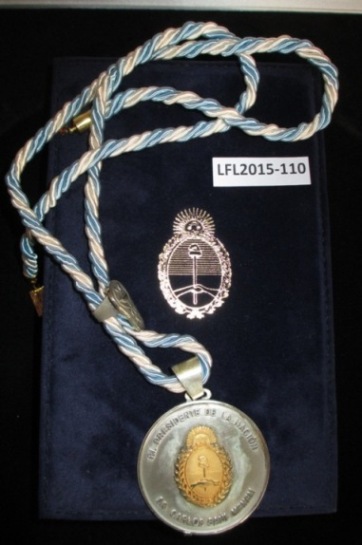 Moneda medalla de 50 mm de diámetro, de plata con escudo de oro con cordón celeste y blanco